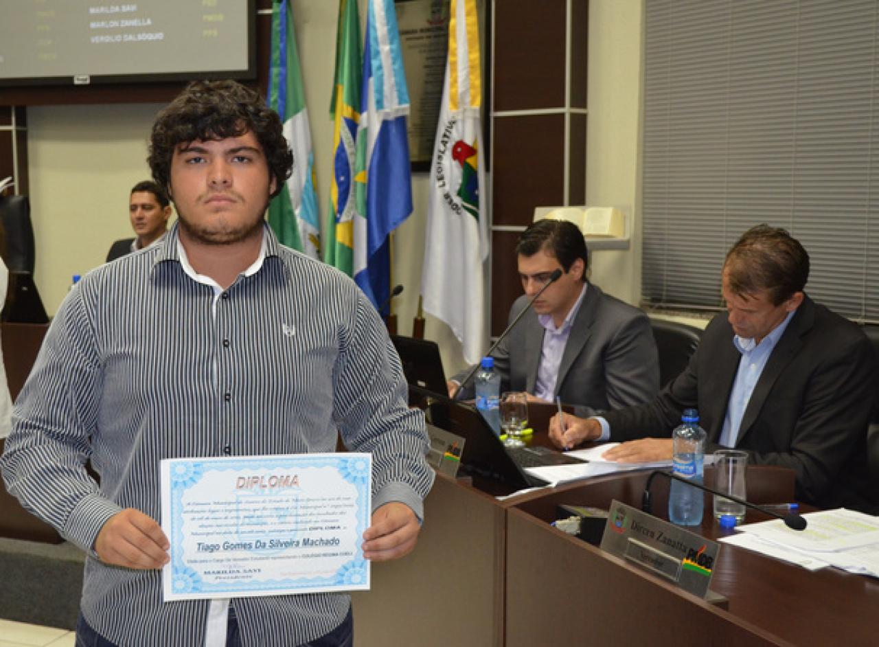 O vereador estudante Fabio Pedrotti, que representa a Escola Estadual Mário Spinelli se pronunciou em nome dos demais colegas. “Vivemos um período de manifestações por todo o país e isso acontece porque a sociedade, inclusive nós jovens estamos descontentes com o sistema que é falho. Ficamos felizes porque a Câmara de Sorriso nos oferece esse programa, para que possamos colocar em prática o protagonismo juvenil, ou seja, o jovem tendo voz e vez. Podermos sentir na pele o que é ser um vereador e termos a oportunidade de buscarmos o bem estar e a melhoria da qualidade de vida da nossa população”, disse o jovem parlamentar.