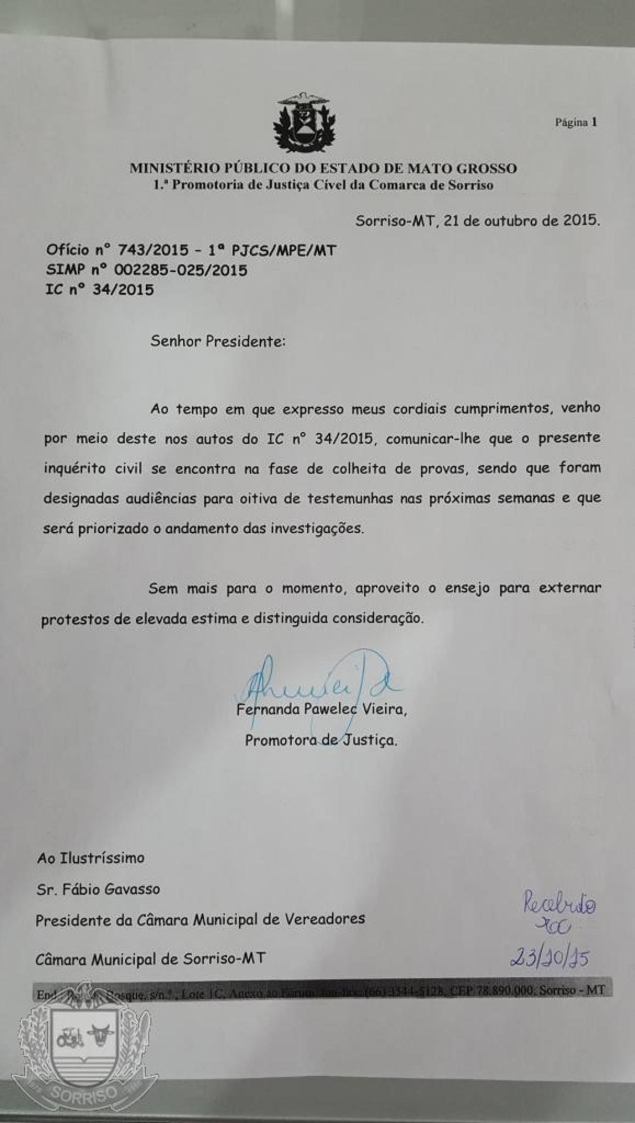 A promotora de justiça de Sorriso, DRª Fernanda Pawelec Vieira, vai ouvir nas próximas semanas, testemunhas de suposta fraude no Concurso Público realizado pela Câmara de Vereadores. Ainda de acordo com oficio recebido pelo presidente Fábio Gavasso (PPS), o Inquérito Civil está em fase de colheita de provas.